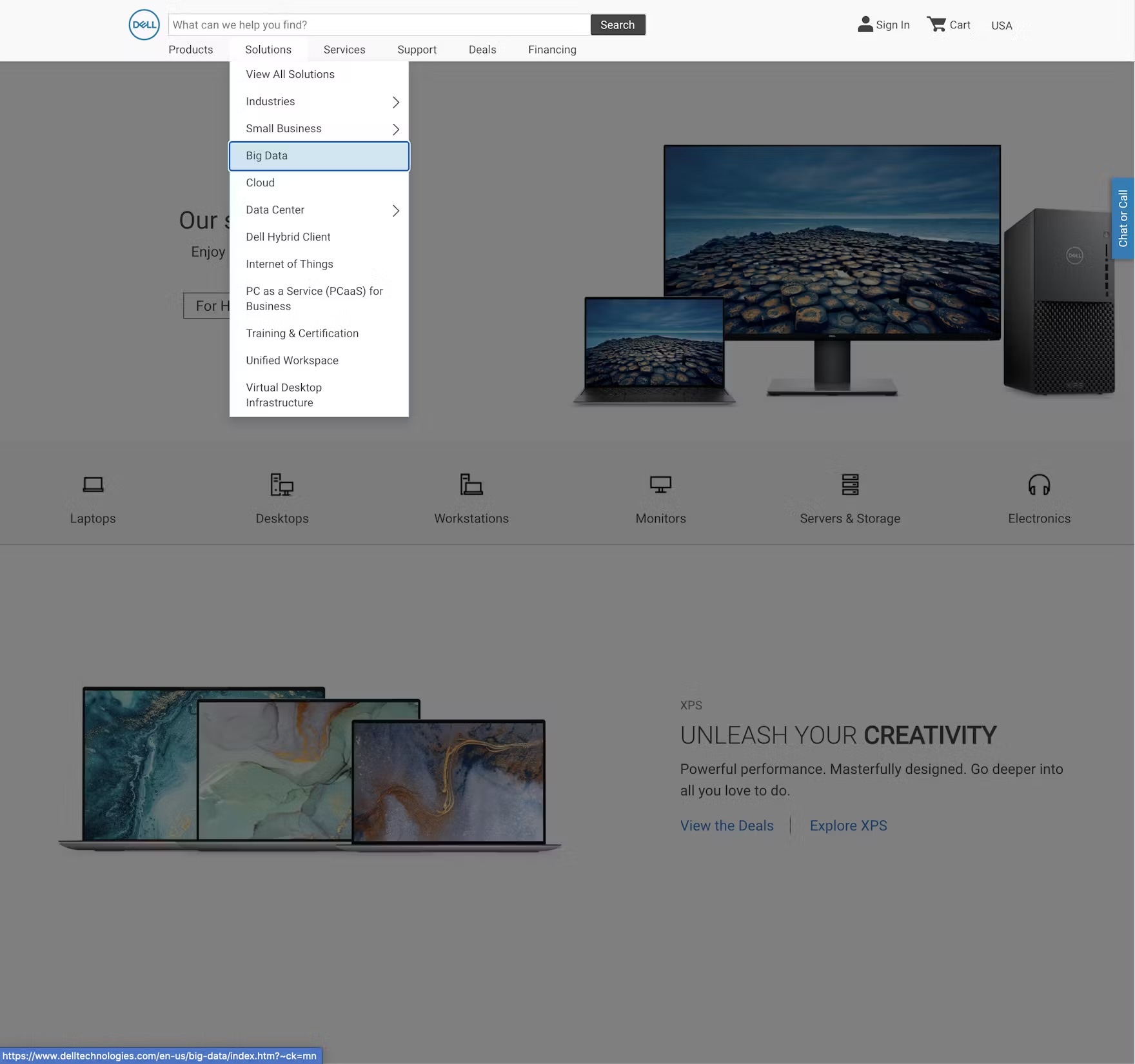At Dell, the site navigation displays a keyboard focus indicator on all menu and submenu items to represent the unselected “hover” action (first image). Once a menu item has been selected by the user (second image), a background color change is used to indicate that selection.