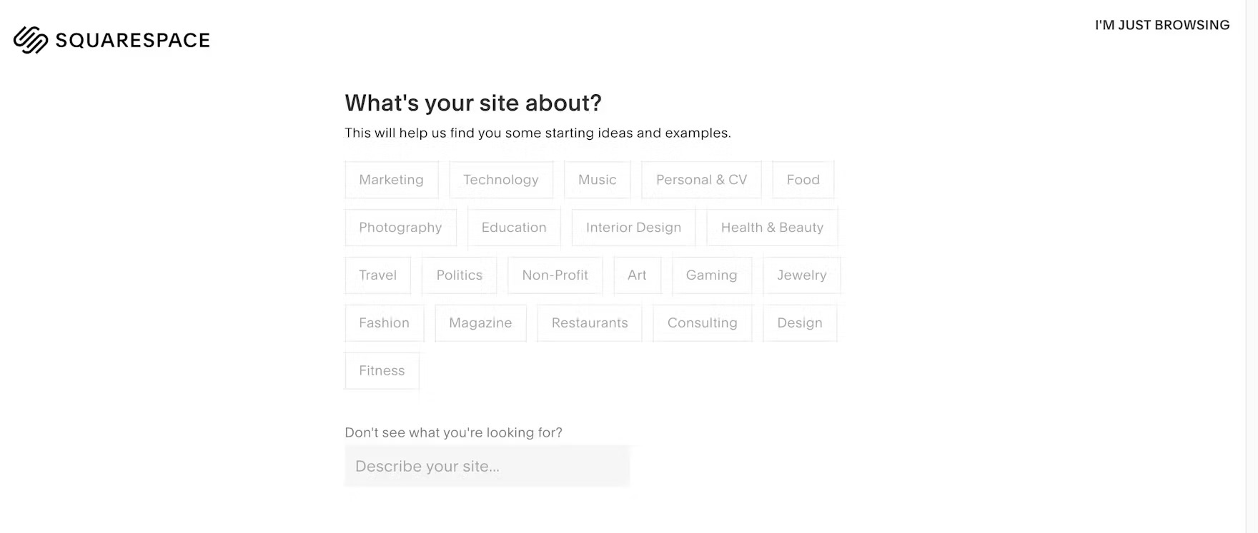 At Squarespace, several page elements violate the minimum contrast requirement for both regular-sized text and large text — coming it at a 1.2:1 ratio. In their unselected state, the buttons (e.g., “Marketing”, “Technology”, etc.) fail to achieve both the minimum 4.5:1 contrast requirement for normal-sized text as well as the 3:1 ratio for page elements (i.e., buttons). Additionally, the placeholder text (“Describe your site…”) also fails the minimum contrast requirement.