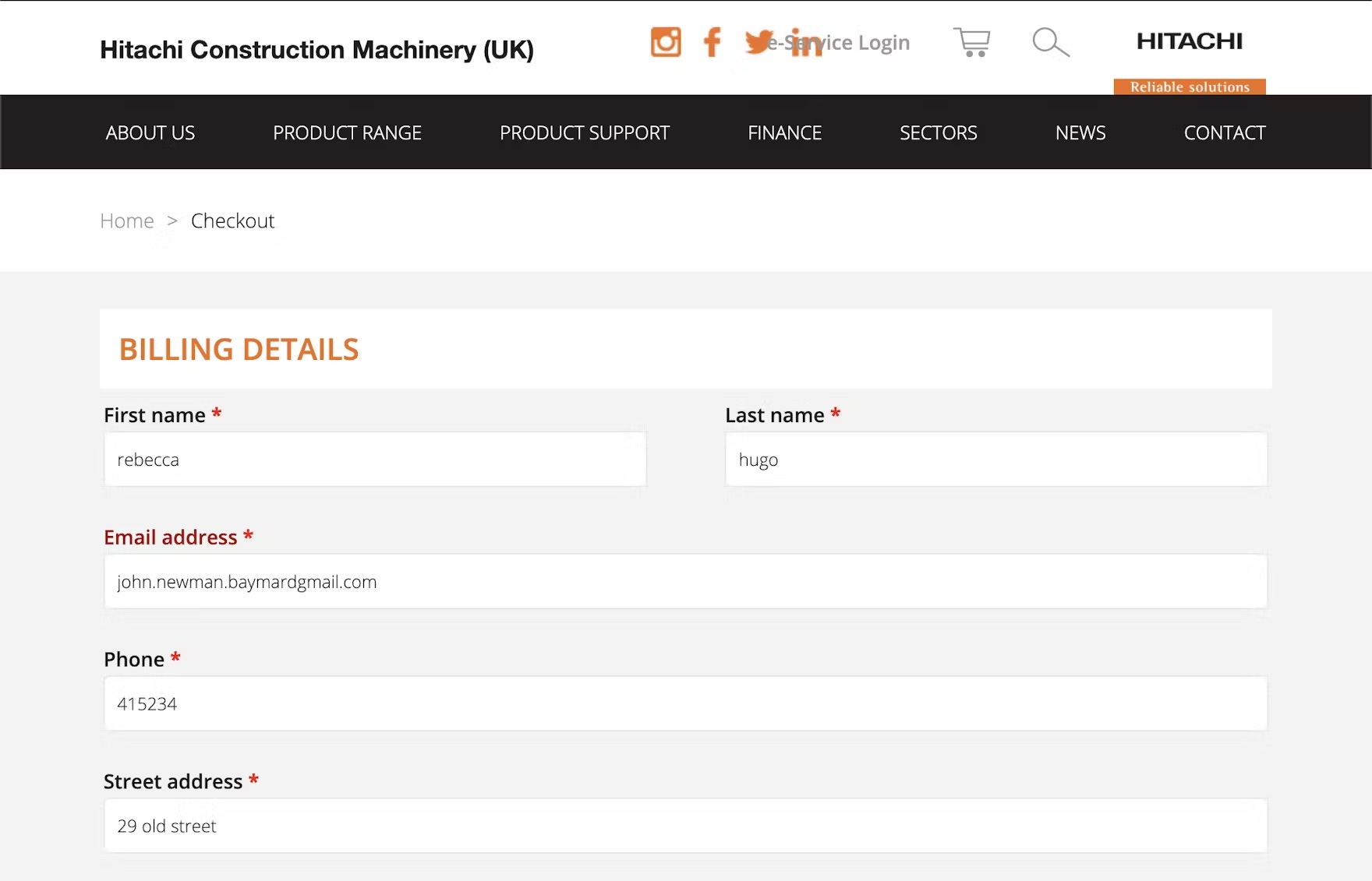 At Hitachi, the user-entered data in the “Email address” field has failed validation. However, the only indication that there is any issue with the submitted information is a change in the color of the input field label from black to red, making it very difficult to notice — especially for color-blind users.