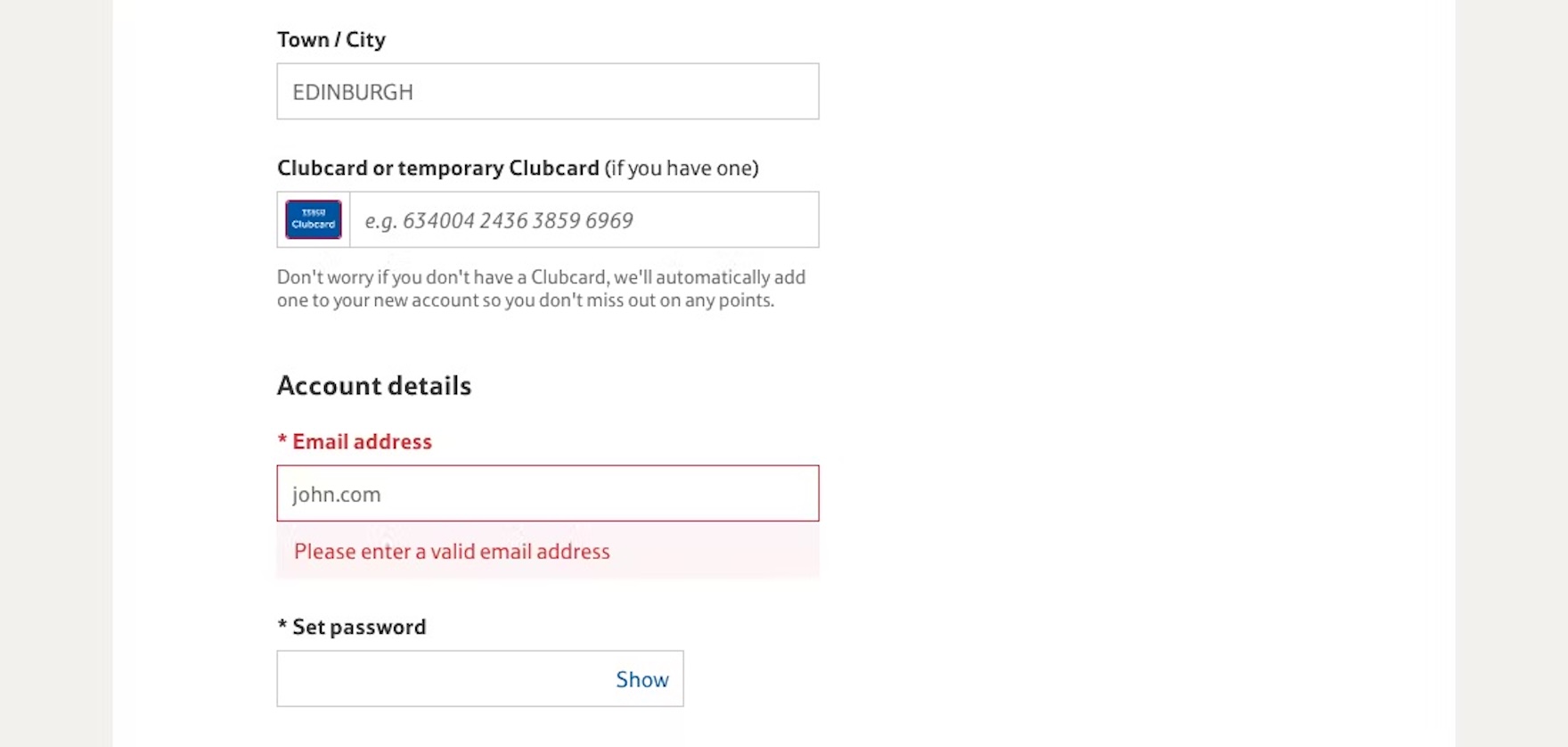 At Tesco, not only is the form field label color changed from black to red, but the form field is outlined in a slightly heavier line weight and in red. Additionally, a message is presented just below the form field with a slight change in background color behind the error message, making it stand out significantly from the surrounding page elements.