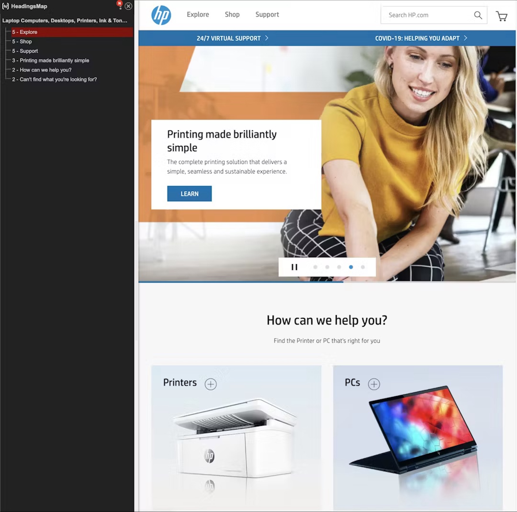 At HP, headings are presented out of order (e.g., <h5> ranks above <h3>), aren’t nested correctly (e.g., <h5>, <h3>, and <h2> are all listed at the same level), and some heading levels are skipped completely (e.g., <h1> and <h4> are nowhere to be found).