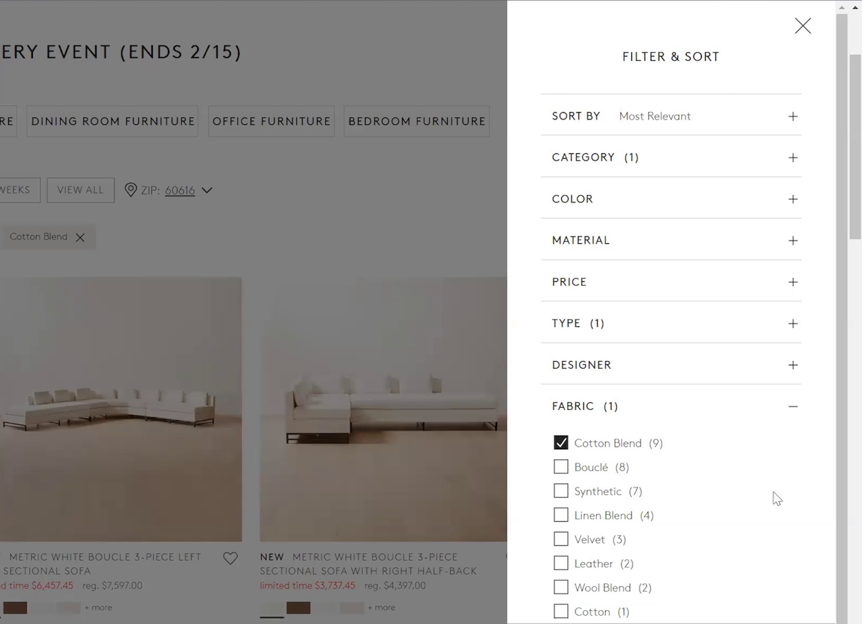 “Now it’s throwing me off…I know ‘Linen’ and ‘Wool’ are different, but then what’s the difference between ‘Cotton Blend’, ‘Cotton’, and ‘Linen Blend’? Ugh…[I want to see] fewer options, more mainstream. Like, what is this B-O-U-C-L-É? Now you want me to Google this to figure out what that even is?… Should I get something [when] I don’t know what it is?” When users don’t understand filter names, they’re likely to avoid them, like this participant at CB2. If users go offsite to learn the unknown term, there’s a risk they won’t return.