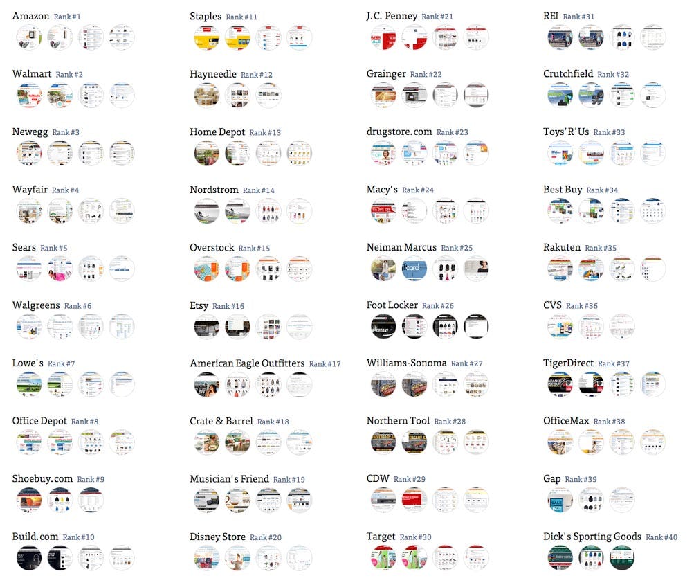 On-site search pages of top grossing US e-commerce sites – you can find all 50 usability evaluations in our e-commerce search benchmark database.
