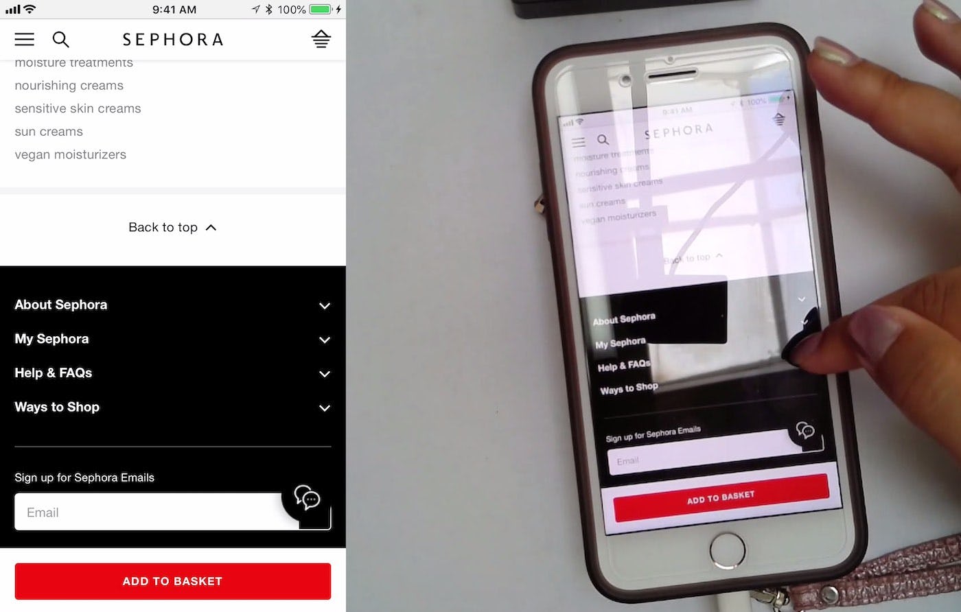 Mobile sites may also consider nesting footer links and paths into collapsed sections, as Sephora do. This saves space, like seen with the Walmart example, without sacrificing access to those links from the footer, albeit nested. Again, it’s still important that the footer links are grouped semantically as the user still needs those key words and phrases to establish whether the information that they’re looking for can be found in the grouping or not.