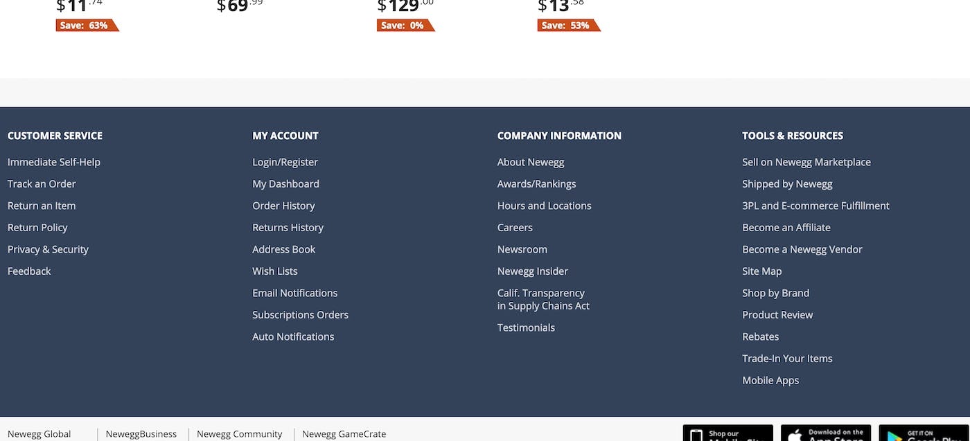 Newegg does a great job of dividing their footer links into four unique functional areas: “Customer Service”, “My Account”, “Company Information”, and “Tools & Resources”. Clear semantic differentiation between footer sections is as important as visual separation.
