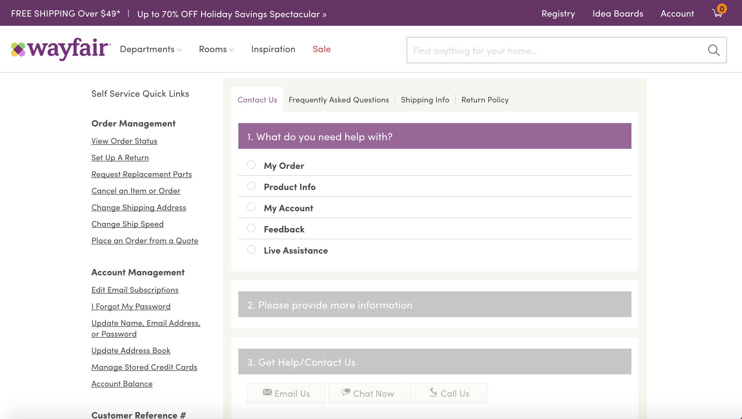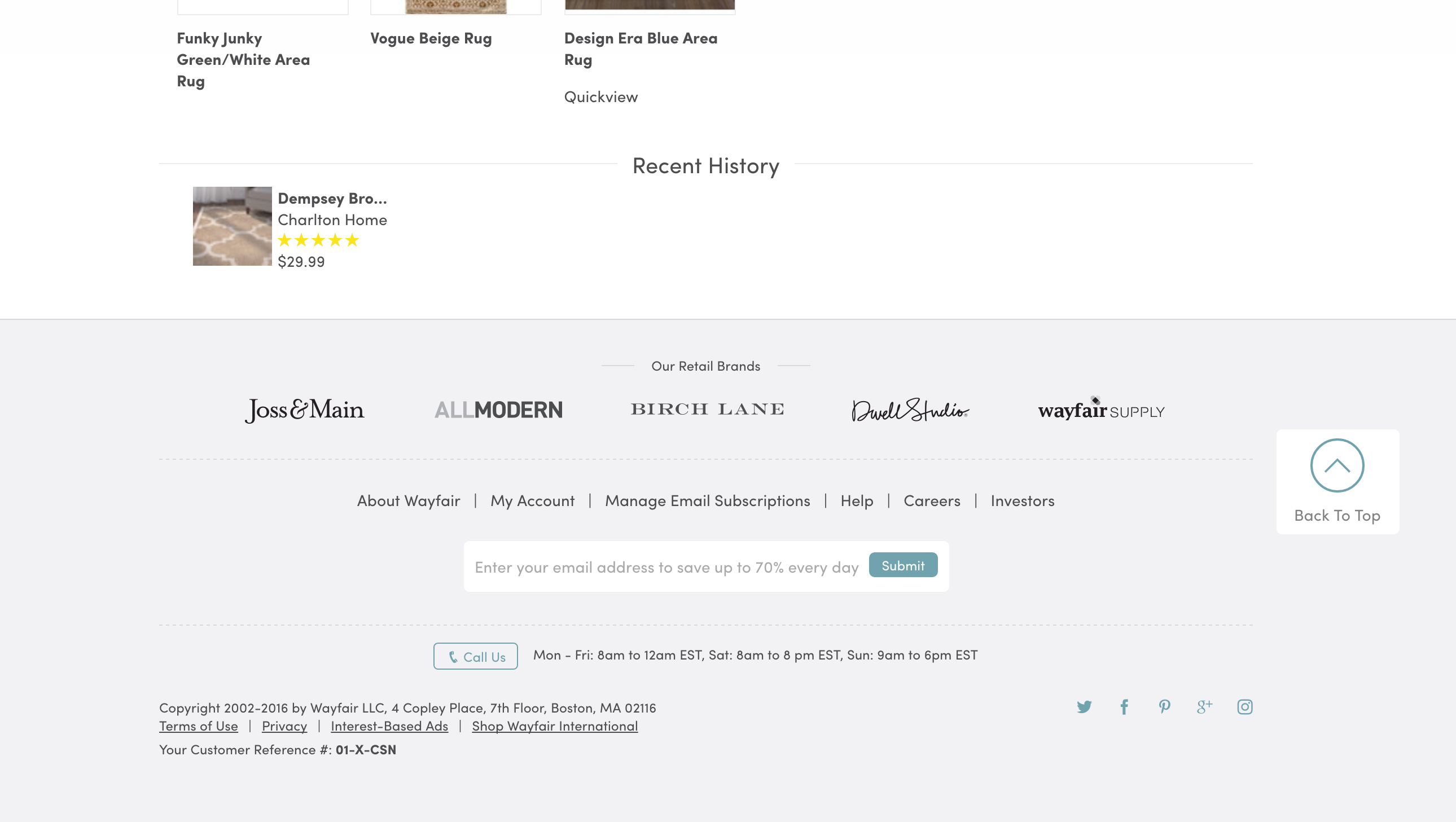 Wayfair doesn’t include a direct link to the return policy in the footer. While scanning the footer for “returns” users must instead first click the “Help” link, and then locate the return policy link.