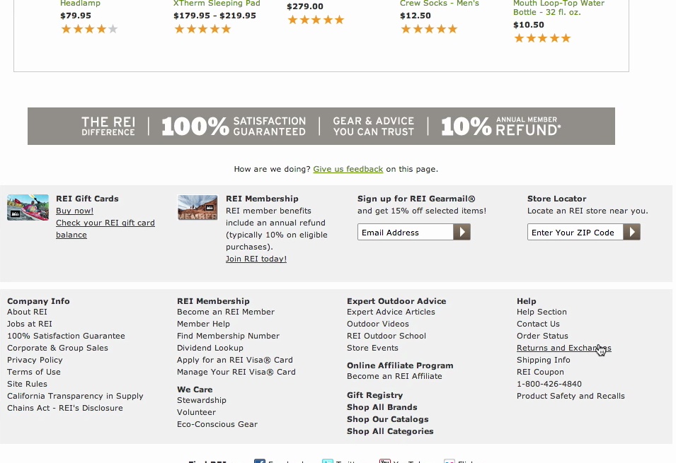 Despite the importance of return and shipping information, and despite a subgroup of users exhibiting the clear behavior of going straight to the sitewide footer, 20% of e-commerce sites don’t support this user behavior. Many sites make it unnecessarily difficult to find their shipping and return information in the sitewide footer by tucking their “Return Policy” away behind generic footer links to “FAQ” and “Help” sections, failing to have direct stand-alone links to “Shipping Info” and “Return Policy” from the footer.