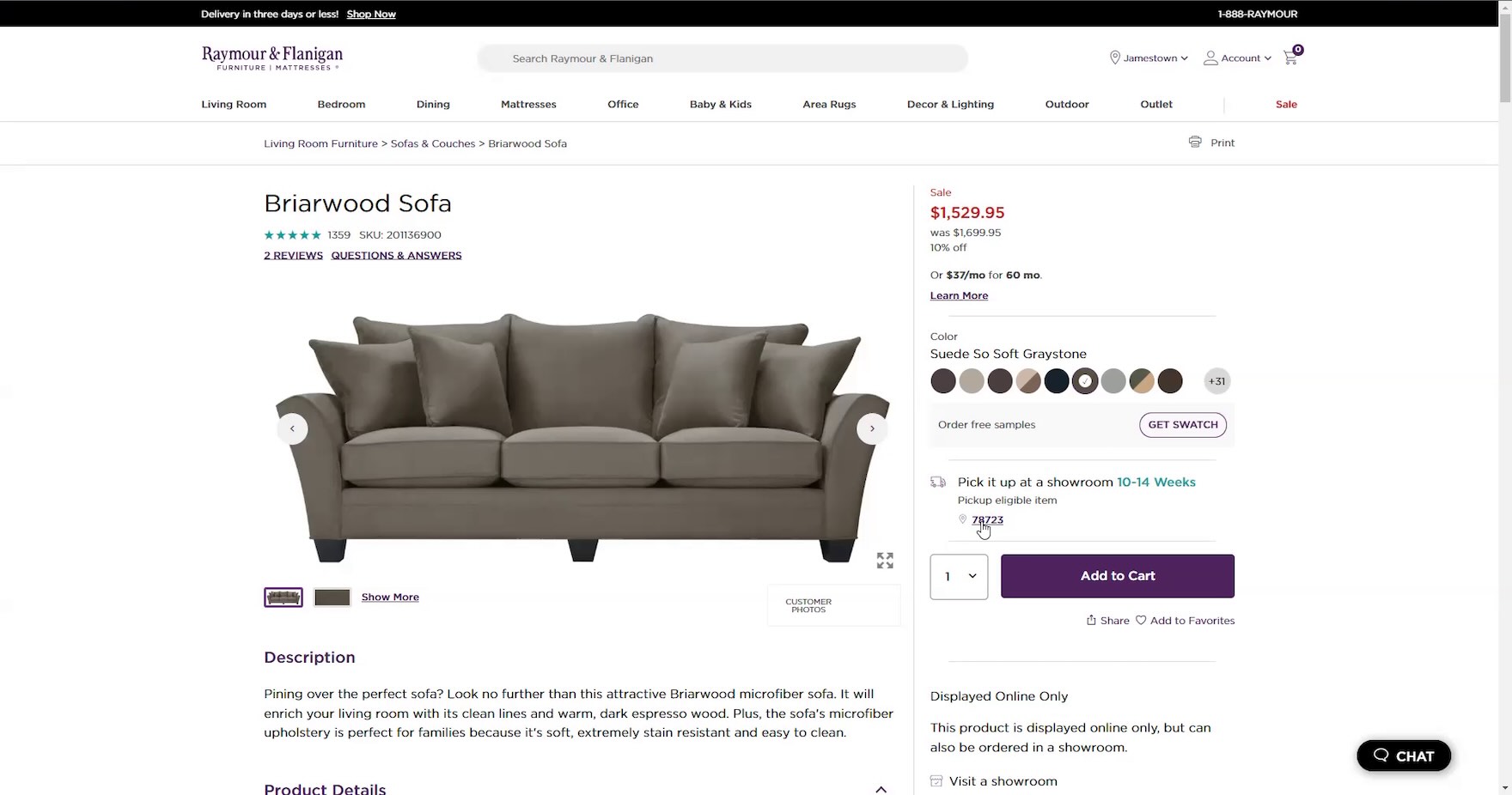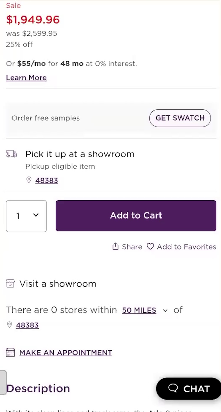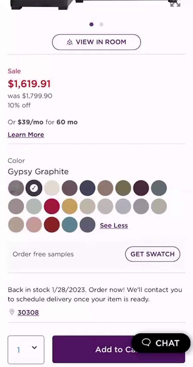 “It says ‘Order free samples’. That’s something I might do ‘cause I am a touchy person, so I want to feel it. There’s nothing worse than to buy something you really like, it looks good, but it just does not slap when you’re laying down on it. Like it’s just not a nice material. Maybe it’s itchy or whatever.” This participant at Raymour & Flanigan on Android appreciated the option to order a sample, offering her a way to assess the tactile feel of the $2,000 couch’s fabric.