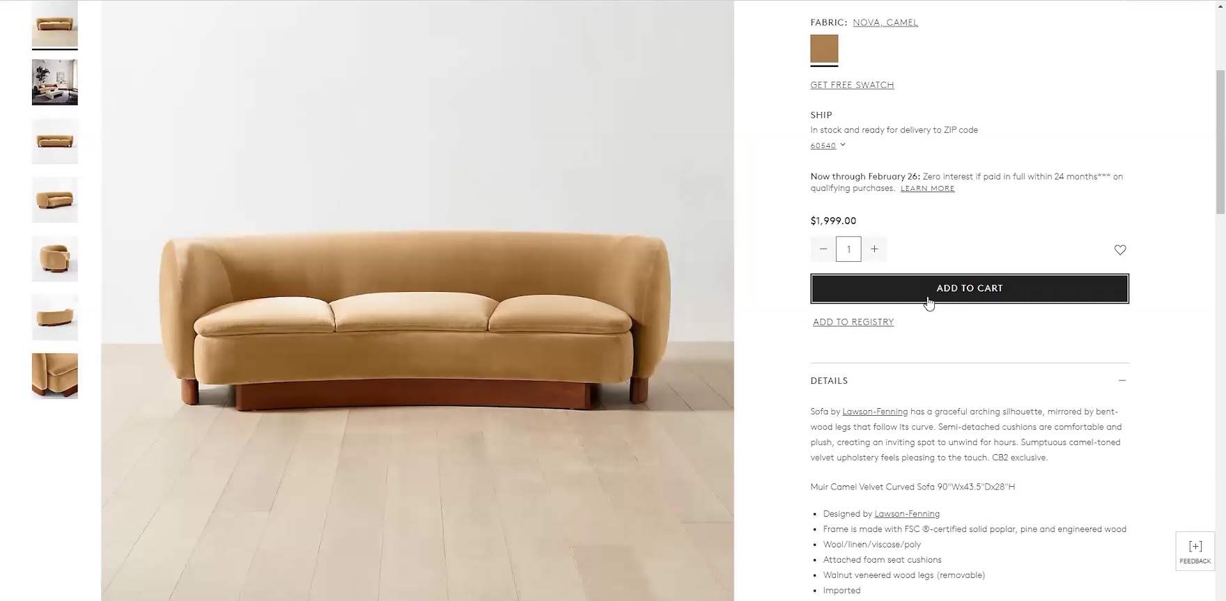 “I almost wonder if I might be able to go to Seattle and see it. It might be worth it because the price here, that’s an expensive sofa. I kind of hesitate buying a sofa online without seeing it first. So [I’ll click] on that, ‘On Display In My Store’.” This participant at CB2 appreciated the option to easily check if the sofa was on display at a nearby store; the option to see it in person made her more comfortable with the idea of purchasing such an expensive item online.