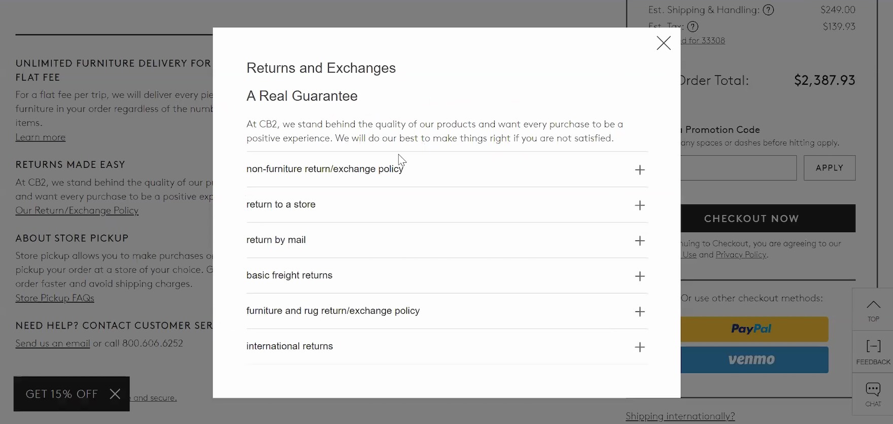 “No way I’m throwing a couch in my car to return to the store. So just looking to see what their policy is for that”, this participant at CB2 explained as she scrolled down the cart to look for information about the return policy and found a link reading “Our Return/Exchange Policy” (first image). She clicked the link and an overlay opened with the level of detail she was looking for: “So it seems like you have to call them within seven days and after that it has to be back within 30 days. And you have to pay a restocking fee which totally makes sense for a product like that. So I would be satisfied with that” (second image). She continued on to checkout.