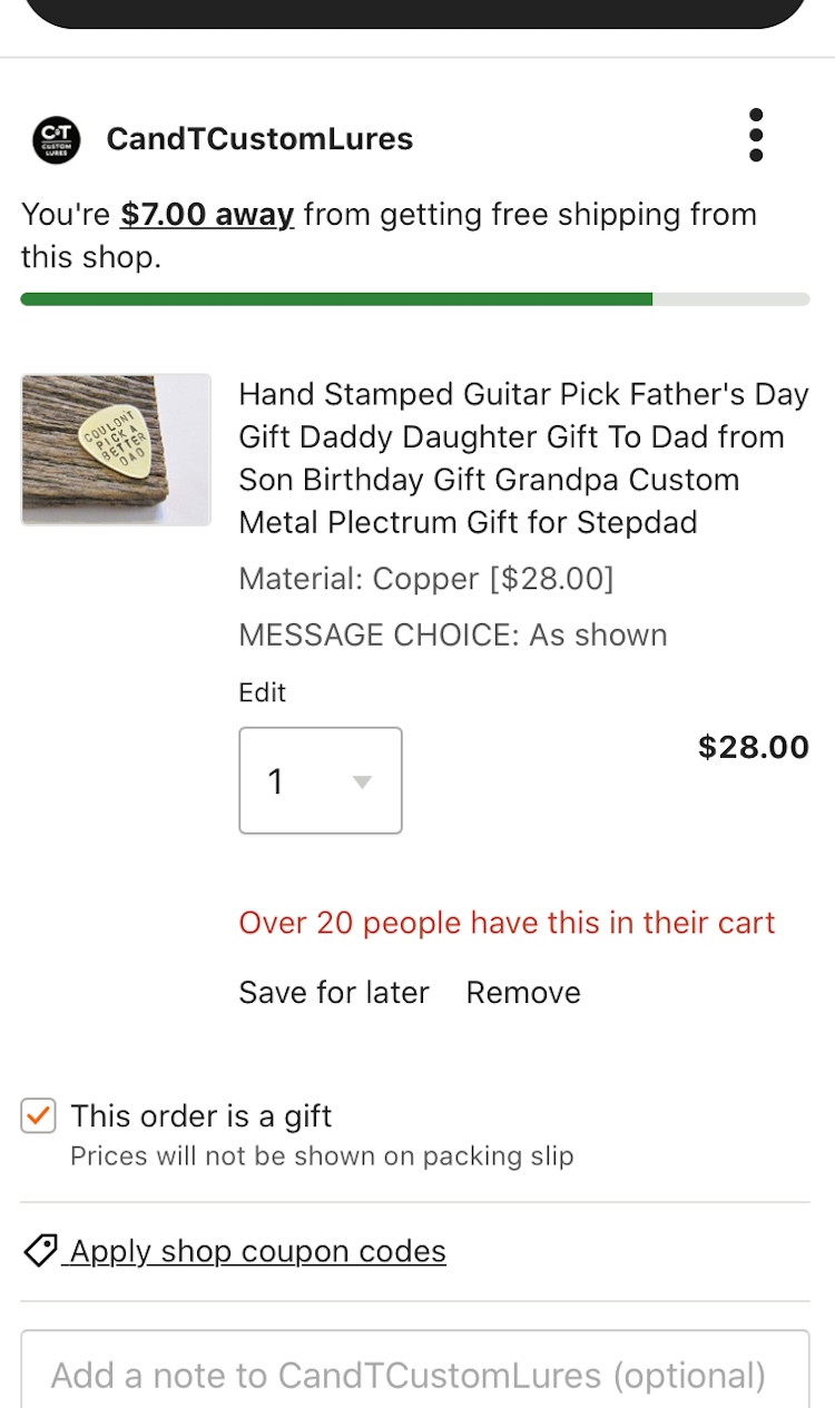 On Etsy, despite an order being marked as a gift in the cart (first image), “Billing = Shipping” is selected by default at the payment step (second image). Users looking to send this order as a gift would have to be very diligent in setting the shipping address as the recipient’s and the billing address as their own — something in practice many users are likely to overlook.