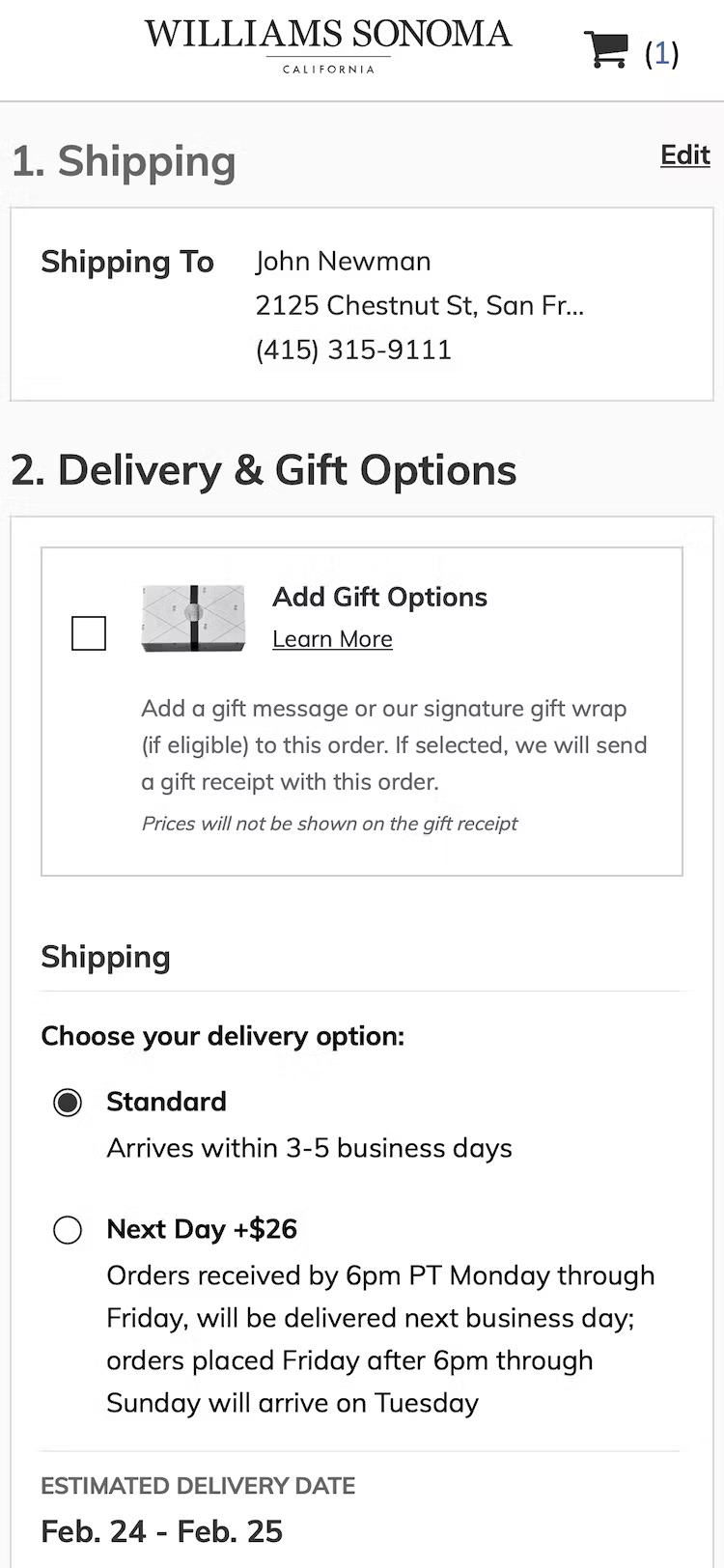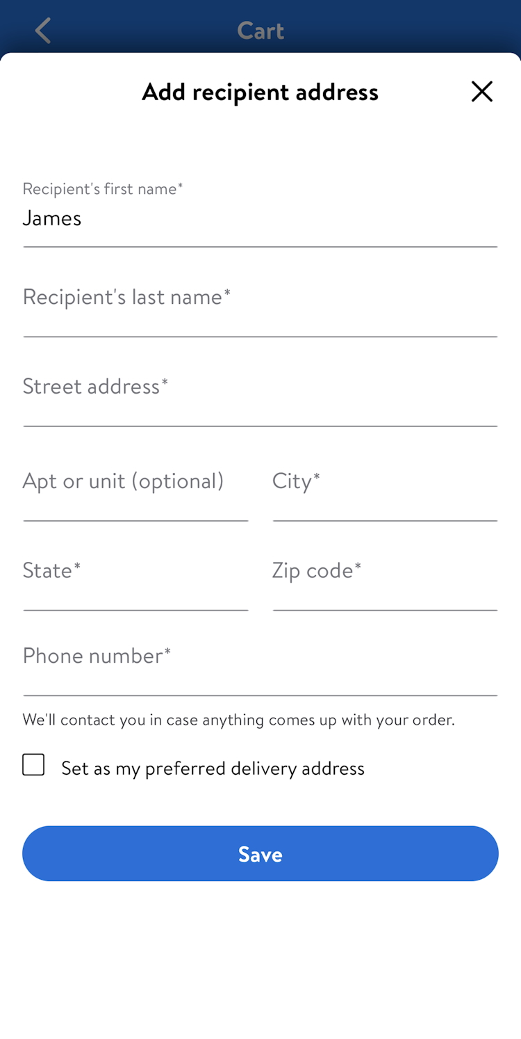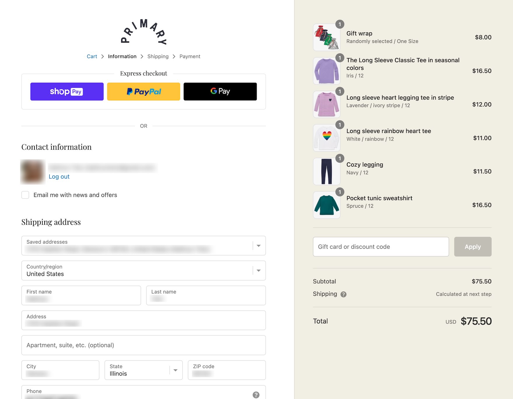 At Primary, returning and signed-in users who add gift options in the cart (first image) still have their saved default shipping address displayed during checkout (second image), making it more difficult for users to input or select the recipient’s address.