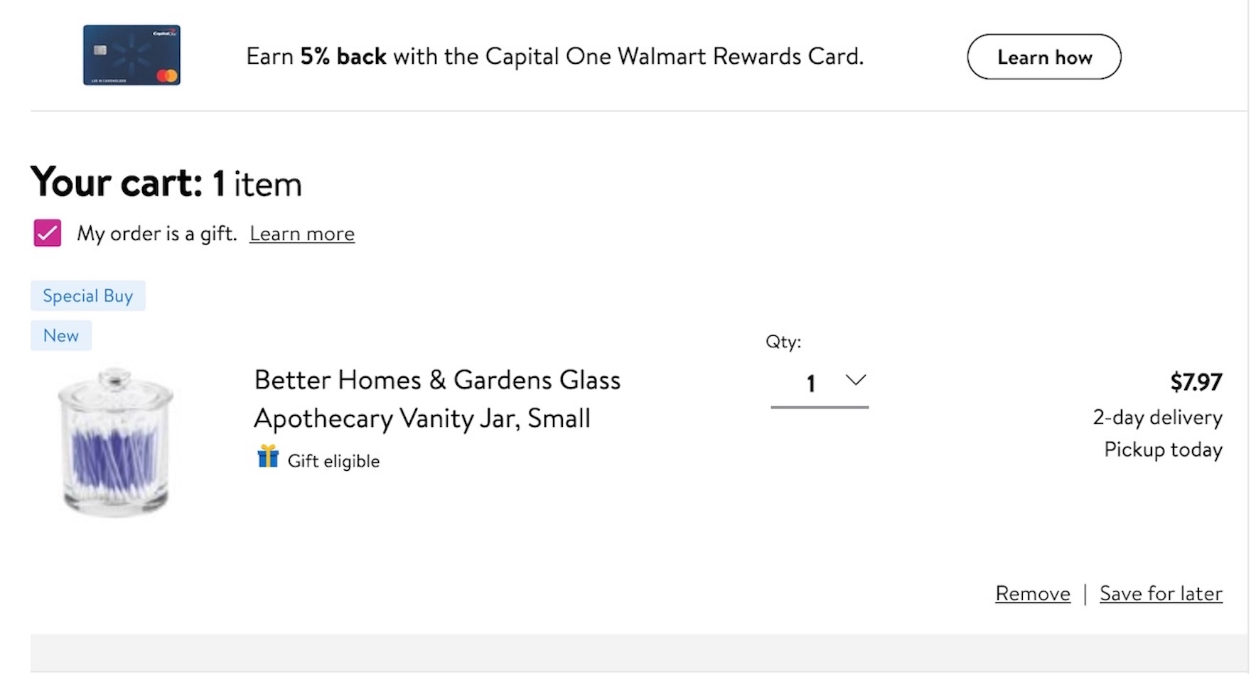 Target does not offer gifting options on their product page. However, it allows users to do much more than simply add the product the cart — for example, allowing users to choose the product quantity and shipping speed, buy product insurance, and even to add the product to their registry (next to the tantalizing image of a gift box). Adding gifting options here would help those users looking to make a gift purchase feel confident going forward to the cart.