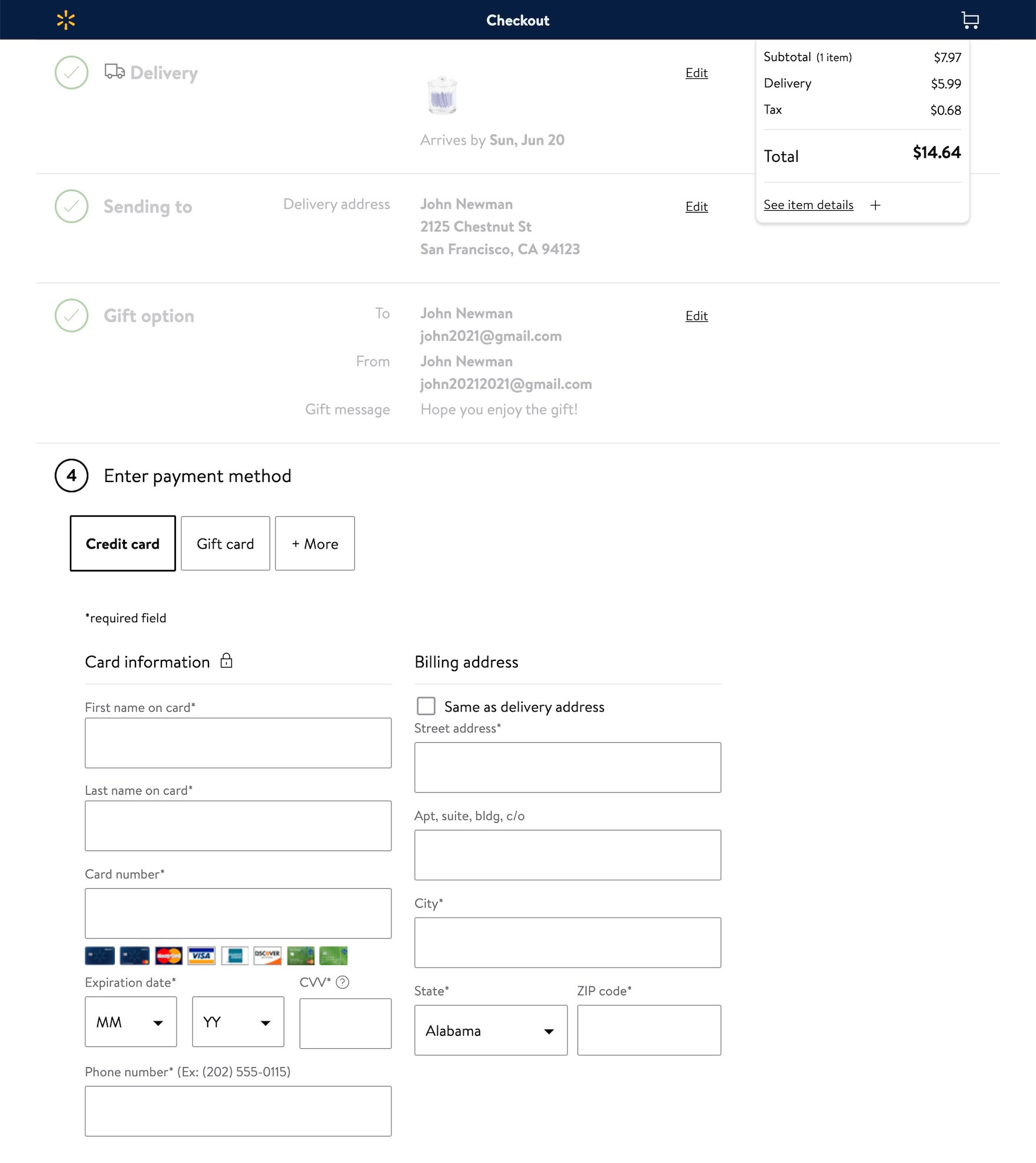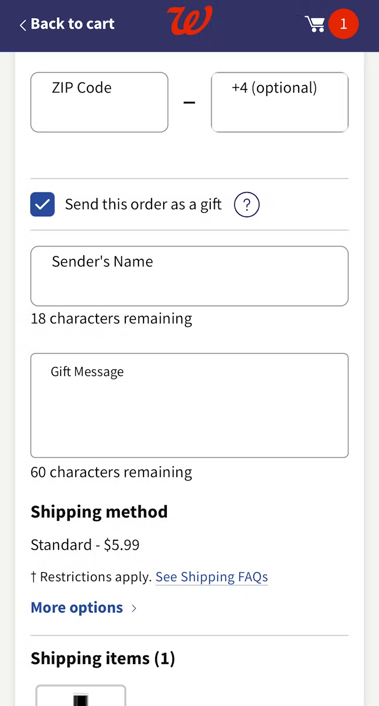 At Walmart, designating the order as a gift in the cart (first image) results in the ”Same as delivery address” checkbox on the ”Payment” step being unchecked by default, in contrast to its usual default setting for nongift orders (second image). Going a step further, the site dynamically updates the ”Shipping Address” step to specify that the address should be the recipient’s (third image).