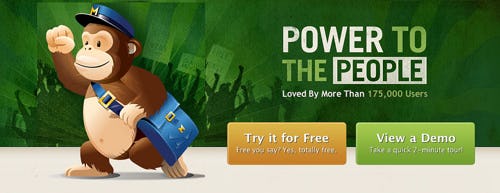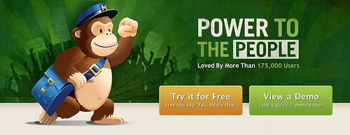 Besides looking odd, this immediately moves focus away from both headline and call to action, towards the chimp itself. When looking away, the chimp becomes a distraction which actually hurts conversion instead of improving it. The chimp is reduced to a useless decoration instead of vehicle for directing the visitor’s attention.