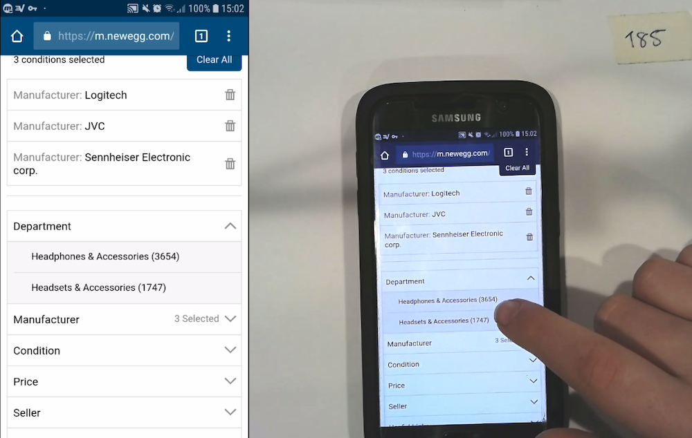 “Uh…okay. The filters aren’t that helpful. They’re not giving me headphone-specific filters for things like ‘Over-the-Ear’, ‘Under the Ear’, ‘Noise Cancellation’, ‘Noise Isolating’. I’m just getting a generic set.” A different user at Newegg became frustrated when he tried to find filters for product features (first image) that were specifically called out in the list item info (second image). He ended up closing the filter menu without selecting any, and struggled to find a relevant product in the product listing.