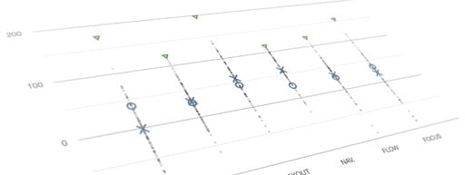 Most noticeably there’s a dramatic gap between the expected average (O) and the actual average (X) in the Data Input category. In other words, of the top 100 e-commerce sites the average site performed significantly worse than expected with numerous violations of even basic form field usability guidelines. Also notice how the site scores (grey dots) are much lower in the Data Input category compared to all other categories, with half the top 100 sites performing downright poorly, and the other half fairing only halfway decently. This is surprising (and frankly unacceptable) considering the wide availability of form field usability research.