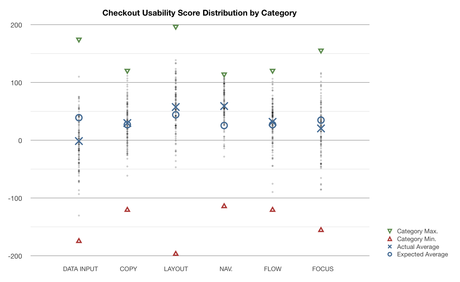 Distribution chart of checkout usability scores divided by category. Each summarized site score is plotted as a grey dot, along with a category average (marked X), the expected/theoretical average (O) as well as the theoretical minimum and maximum score of the categories (red and green triangle).