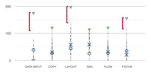 Looking at the distribution chart we see that even the best sites has significant room for improvement in three of the categories: Data input, Layout, and Focus.