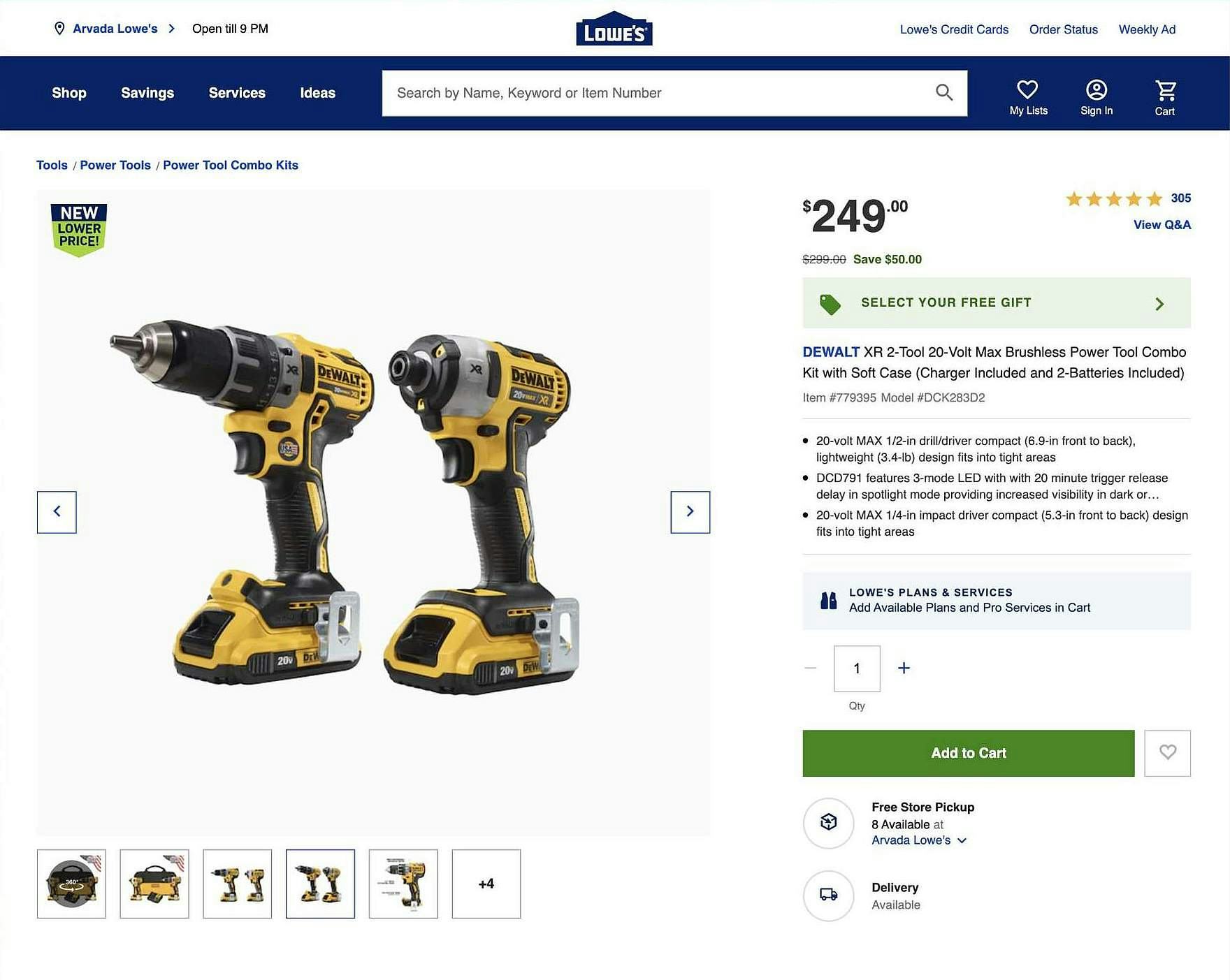 At Lowes, most of the visual elements on this product page have alt tags. For example, there is the primary alt text for the product image (DEWALT Power Tool Combo Kits #DCK283D2 Product Image #3), then there is an additional alt tag for the badge at the top (new lower price), and finally there is an alt tag for the review stars (5.0 out of 5 stars with 305 reviews). Together these tags convey all the necessary nontext information visible on the page. Note, there is no separate alt tag for the thumbnail image.