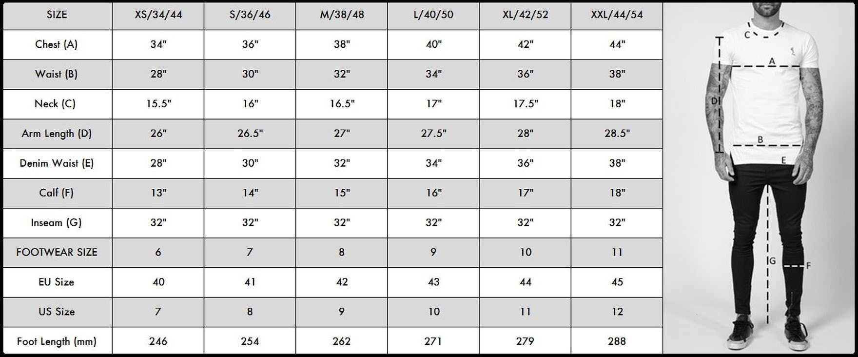This size guide at True Religion is presented only as an image with alt="Men's Size Guide" announcing the purpose of the image, but not any of the information contained therein — which is what a visually impaired user would need if they visited this image. Complex images such as size guides need to be carefully presented — typically as a table — to make them accessible to users with visual impairments.