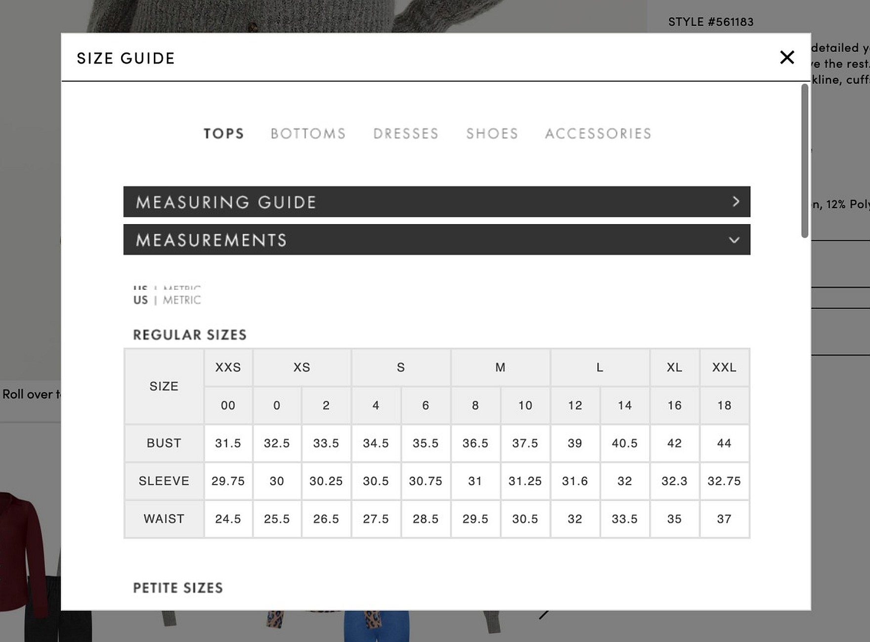 At Ann Taylor, the size chart is presented as a table, which, if implemented correctly, is easily accessible to assistive technologies like screen readers.