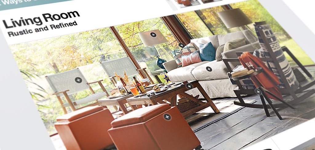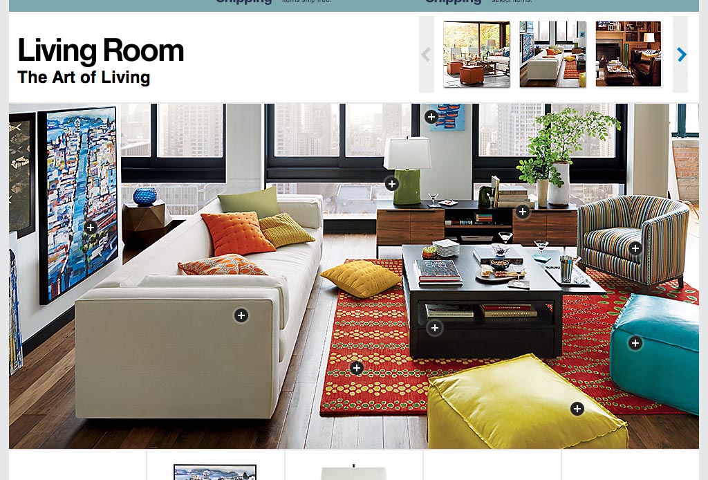 Crate & Barrel mark up their inspirational product images with black ‘+’ buttons that, when clicked, open an overlay dialog with more details on that particular product.