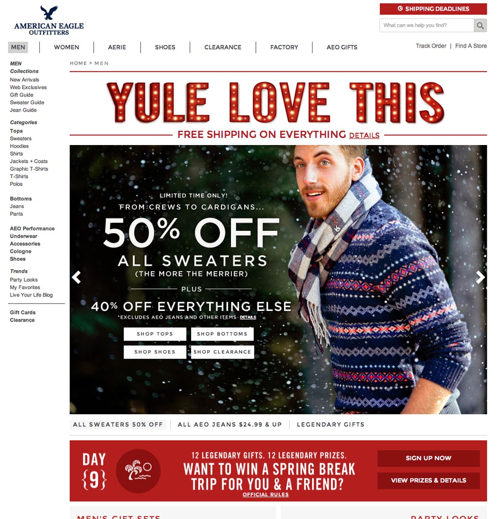 American Eagle Outfitters has a big inspirational product image promoting a “50% off all sweaters” Christmas sale category, however, the test subject was interested in the depicted scarf. Alas, the subject had no way of accessing this scarf as the category was only for sweaters and not scarfs.