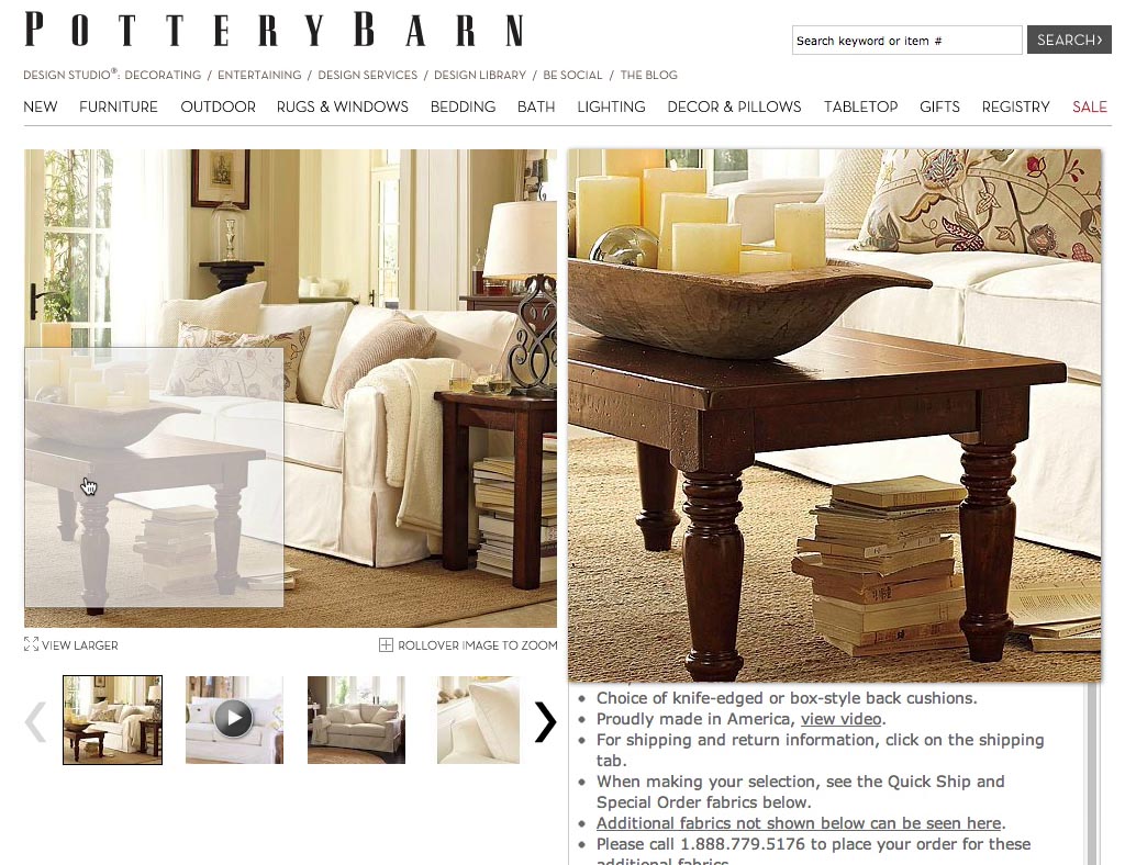 Here a test subject is on the product page of a sofa she has decided to purchase (it’s the white one in the center of the inspirational product image), and now, after adding the sofa to her cart, she also wants to sofa table in the image. Unfortunately, Pottery Barn doesn’t tag their images and the user has no way to access the sofa table from this product page.