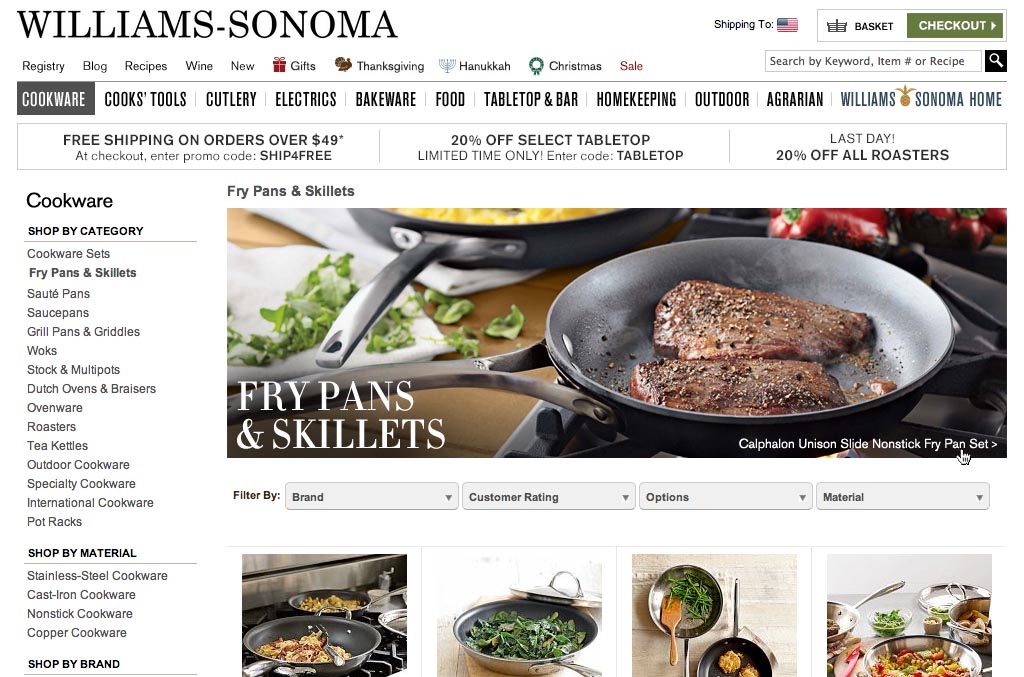 Category header images can be a similar source of user frustration as they often depict specific products. Once again, the solution is to tag the inspirational product image with links to the depicted products. If the image only depicts a single product, a subdued text link - as seen here on Williams-Sonoma - may prove sufficient.