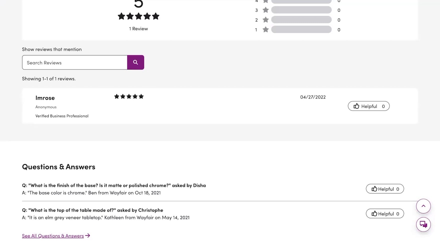 “You can’t really see the top from the pictures. That’s a downside. So I would go to the reviews, see if they posted a picture…[scrolls to reviews]…there’s not enough pictures to know.” The product images for this table at Wayfair didn’t have the views this participant was looking for (first image), so she tried the reviews section next (second image), but there were no user photos there or anywhere on the product page, so she abandoned the product regretfully.