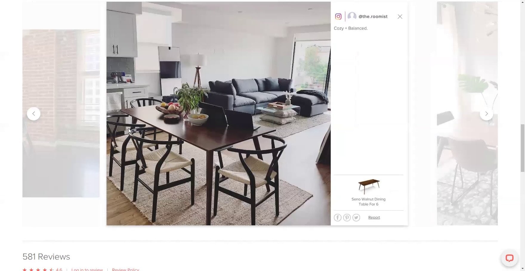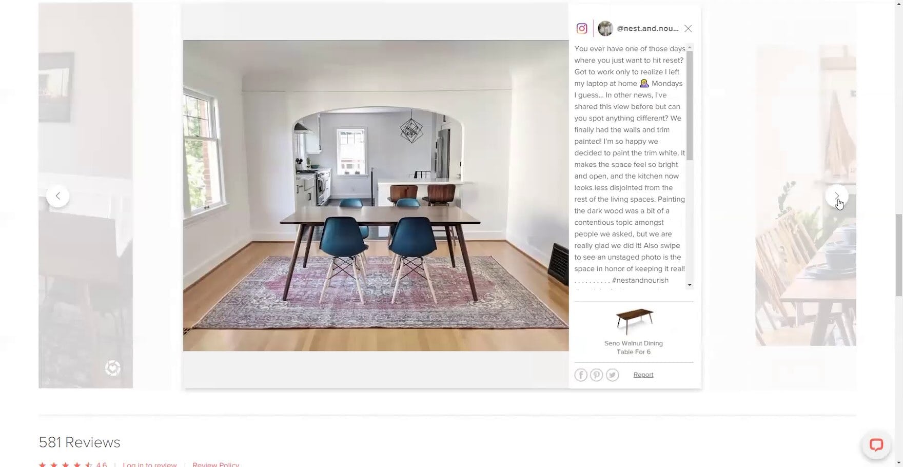 “I do always like the customer photos, because they make it a little bit more realistic. Then I know people are willing to actually put it in their homes.” The social media carousel on this Room & Board product page offered this participant proof that other buyers had success with the table, making her more confident in her purchase.