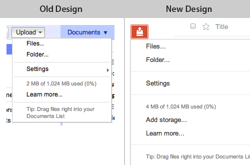 The new Google Docs design (to the right) for uploading files looks really good, but if you’re a new user it may be difficult to understand at first.