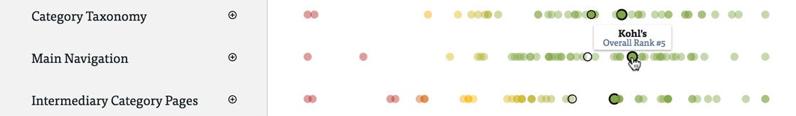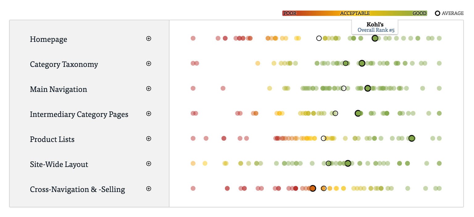 Kohl’s UX performance across 7 core sub-elements of the homepage and category navigational experience, plotted against 49 other top-grossing e-commerce sites. The scores/dots for the 7 sub-elements are the summarized score of a total of 3,950 usability scores manually set by Baymard. (Tip: you can also browse a free interactive version of this scatterplot.)