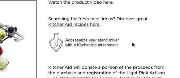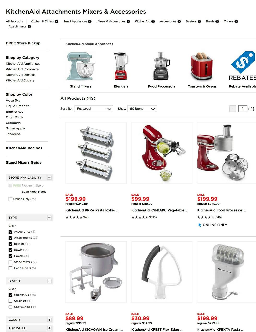 On Kohl’s, compatibility-based navigation is available at the product pages. For instance, on the product pages for KitchenAid mixers, the product description includes a strong call to action for matching attachments. This path leads users to an accessory category with a long list of filters pre-applied to show all matching mixer attachments, and easily allows users to de-select filters to narrow down the types of matching attachments displayed.