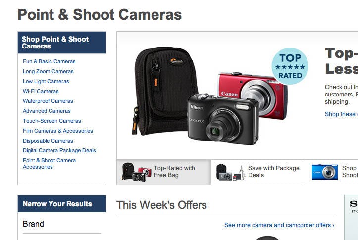 Note at Best Buy how the “Point & Shoot Camera” category has incorrectly been implemented with the different “use types” as sub-categories – making it impossible to get a list of all point & shoot cameras. This instead forces users to select an overly narrow sub-category. To make matters worse, the sub-categories are highly overlapping. While “Usage Type” is a powerful browsing option, it should instead be implemented as a thematic filter within a generic “Point & Shoot” category.