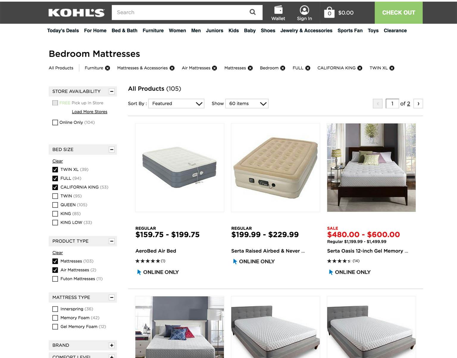 At Kohl’s the mattress category correctly implemented the different mattress types (“Mattresses”, “Air Mattresses”, and “Futons”), along with the mattress sizes and brands, as filters instead of categories. This saves users from having to make an up-front distinction and allows them to set any combination of filters to suit their purchase preferences.