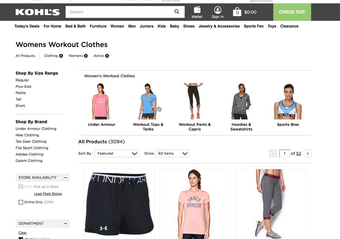 At Kohl’s important product type filters, such as “Activewear”, are promoted alongside the categories at the Intermediary Category Page for “Womens” (left image). When clicked, note how the landing page returned is in fact a product list with the “Active” filter pre-applied filter (and a custom title for SEO). Also note how that landing page further promotes a new set of highly important filters, such as “Workout Tops” and the brand “Under Armour”.