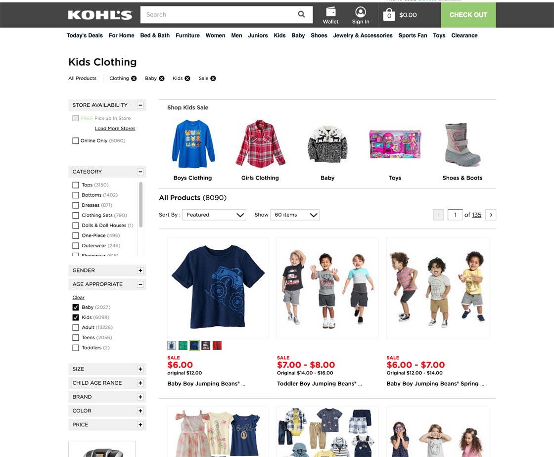 During testing we’ve found that a well-performing pattern is to promote highly important filters as if they were categories. These filtering values can be promoted in the main drop-down navigation, on any Intermediary Category Page, or in promoted paths on the top of the product lists – Kohl’s does all three.