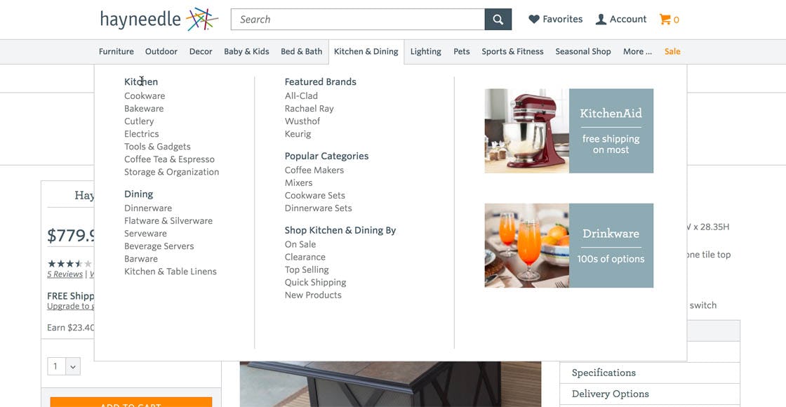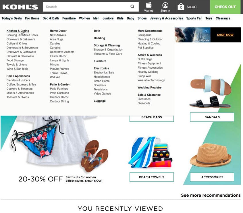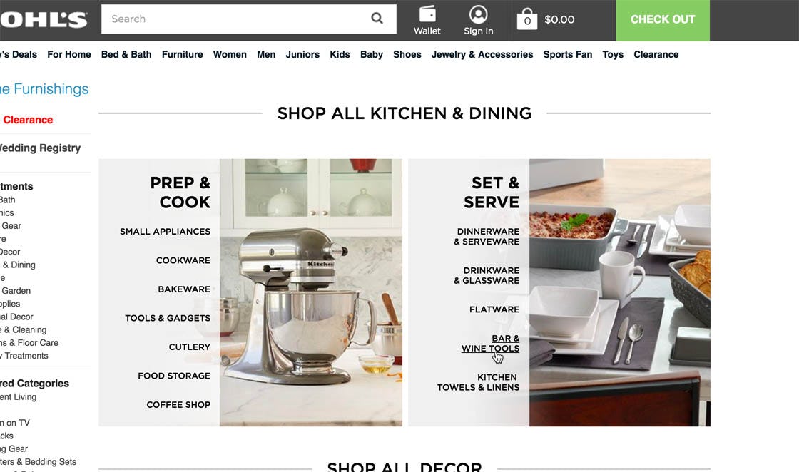 At Kohl’s the parent categories that provide the visual grouping within the main drop-down navigation are also clickable – allowing users to start out by navigating to e.g. the broader “Kitchen & Dining” scope, before committing to a more narrow product scope.
