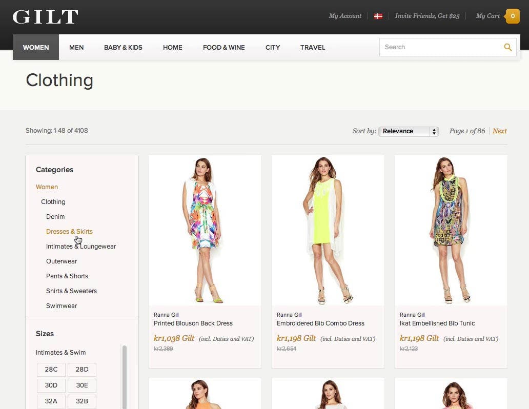 “Clothing” as a product list page rarely makes sense since nearly all users will still need to navigate at least one layer deeper in the hierarchy. When testing Gilt this subject couldn’t find the right category for jackets, as it was called “Outerwear”, and therefore didn’t match the keyword she scanned the page for. Had the “Clothing” category been implemented as an Intermediary Category Page instead of a product list, the subject would have been much more likely to discover the “Outerwear” category.