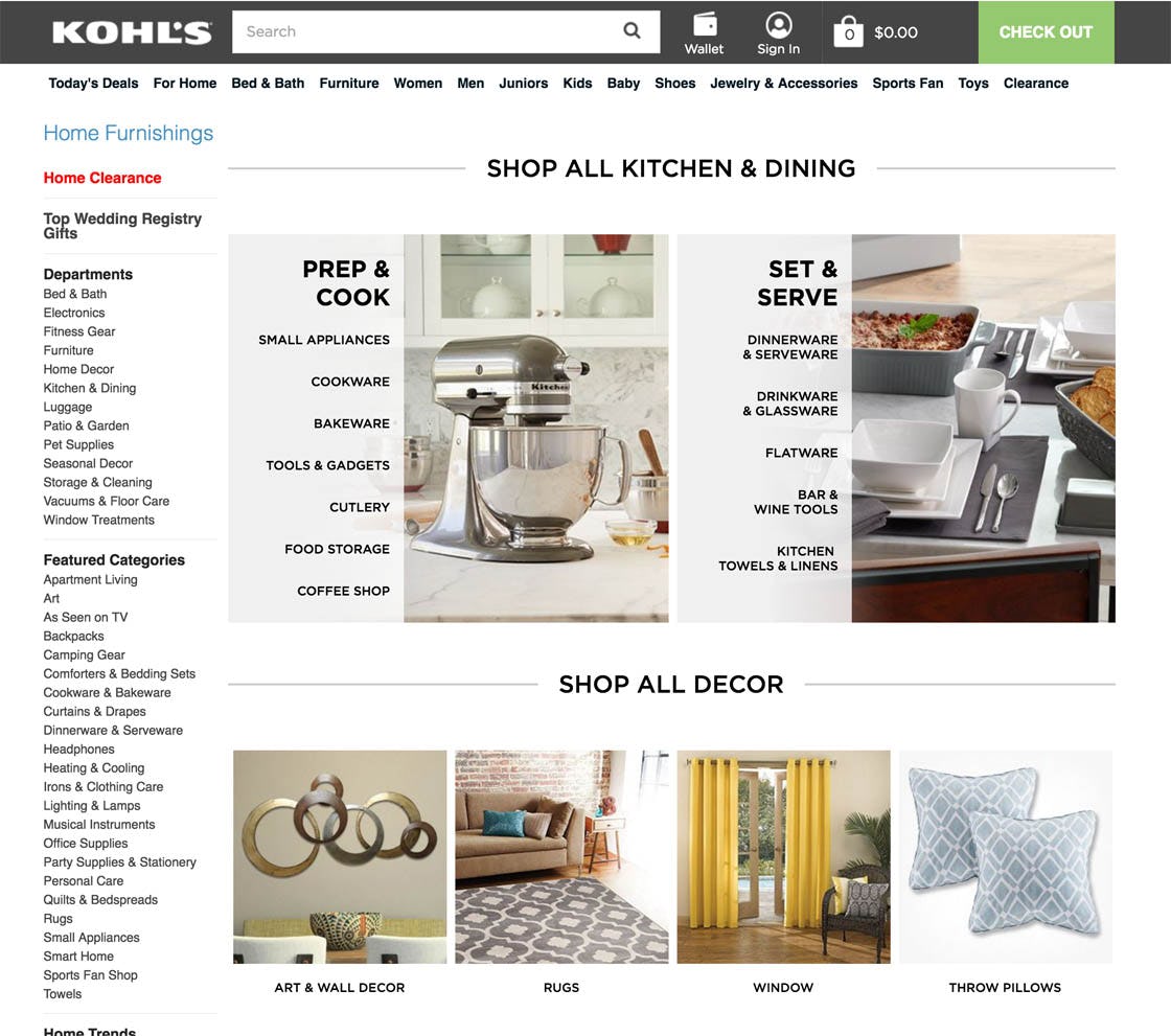 When users choose the very broadest scopes at Kohl’s, e.g. “For Home”, they are given an Intermediary Category Page that guides them further towards the sub-category options, each illustrated with a thematic thumbnail.