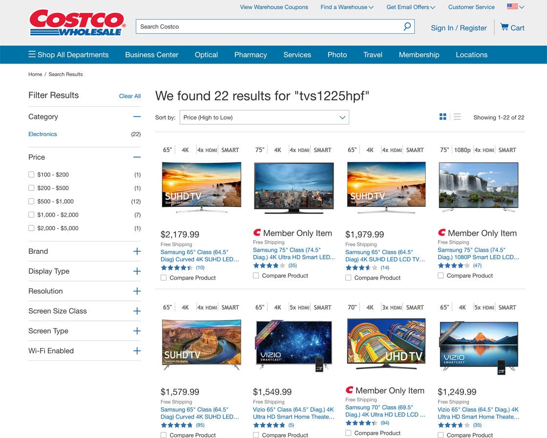 Users landing on Costco, e.g. looking to buy a TV, are likely to be lured in by the promoted path on the homepage showing a thumbnail of two TVs (left image). Not an issue in itself. However, if users aren’t paying attention to the small text reading “Top Selling TVs”, they are likely to be disappointed by the narrow selection of 22 TVs shown on the landing page (right image). With no indication or path to Costco’s full selection of 46 TVs, these users are likely to assume the 22 TVs are all Costco has.