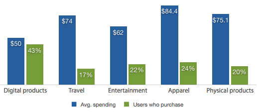 It could also have something to do with the complex search, selection and booking process typically necessitated by travel sites to complete a purchase – all of which is particularly difficult get right on a mobile-optimized website, as revealed during our mobile usability study. For those who do purchase travel products and services the average spend is relatively high at $74 (despite including local travel ticket orders of low price points, such as app-based bus and train ticket purchases).