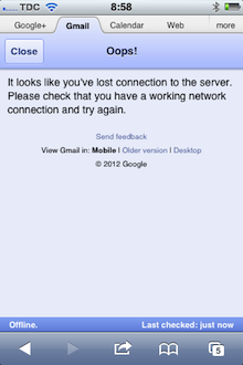 Gmail warns the user about connectivity issues.