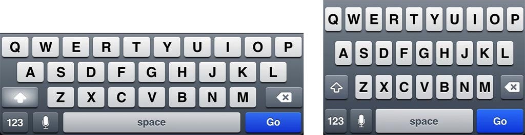So why would anyone want to fill out forms in landscape mode given these constraints? Well, it is actually perfectly understandable, as the hit area of the keyboard’s letters increases significantly in landscape mode compared to portrait mode. For example, on an iPhone 4S the letter hit area increase by 32% (52px*76px versus 83px*63px), seen below: