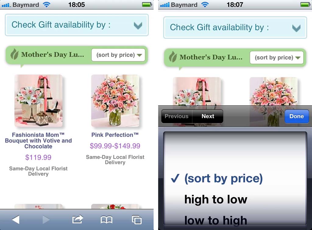When users tested 1-800-Flower’s mobile site, some thought the drop-down label “(sort by price)” meant that the list was already sorted by price — even though it clearly wasn’t. It was only after opening the drop-down field that the users realized that “(sort by price)” was the label for the field and not the current sorting.