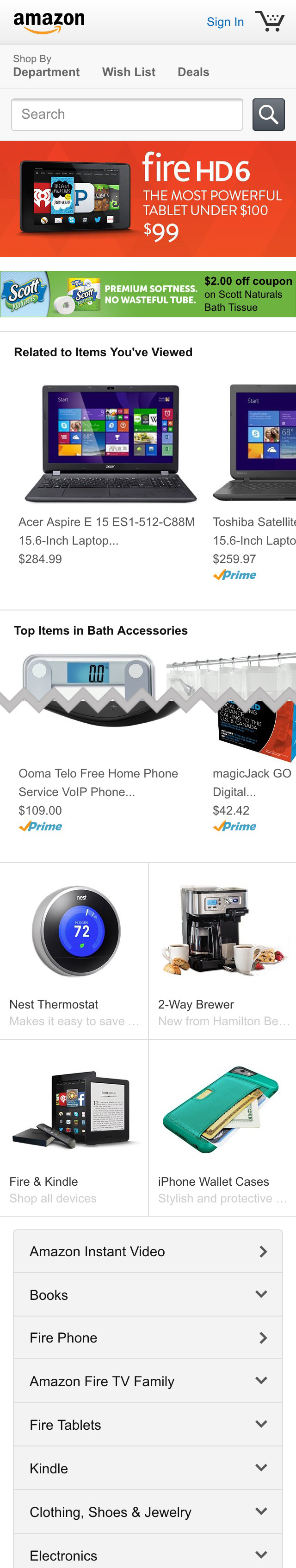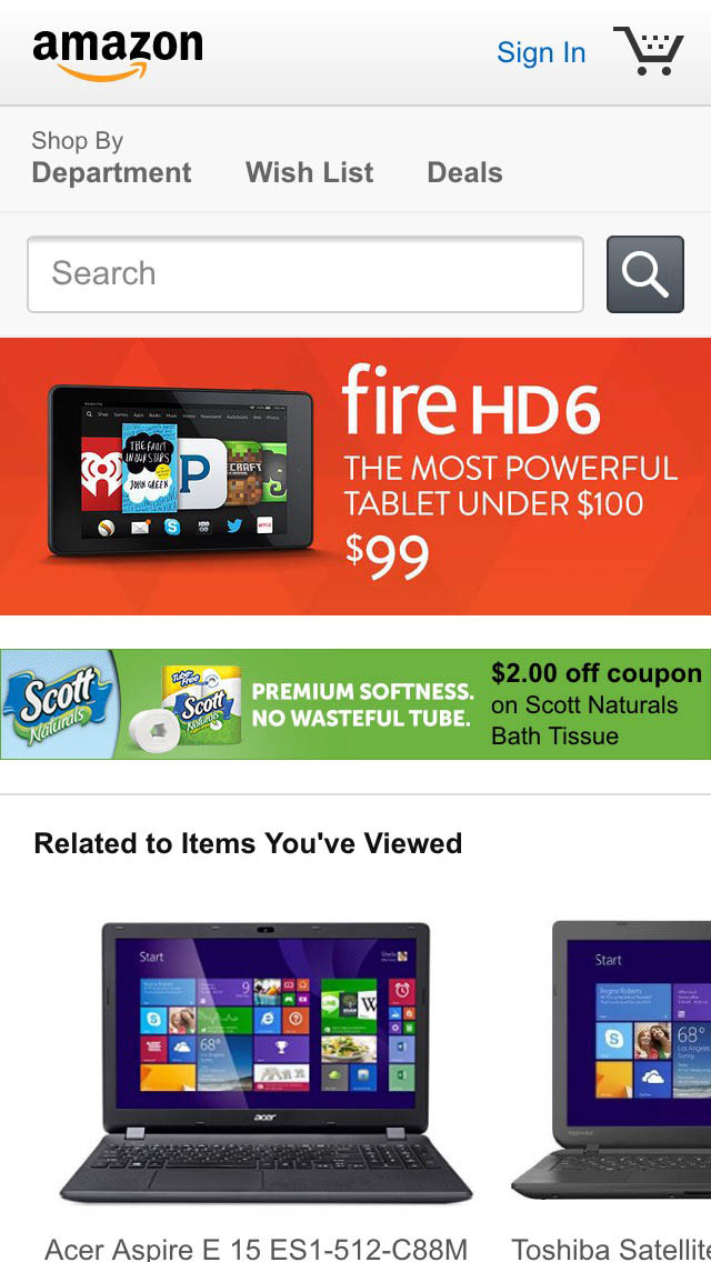 When testing Amazon, a mix of visually featured products, visually featured categories, and a list of key categories are displayed, which proved sufficient to accurately convey the site’s product catalog diversity to the test subjects.