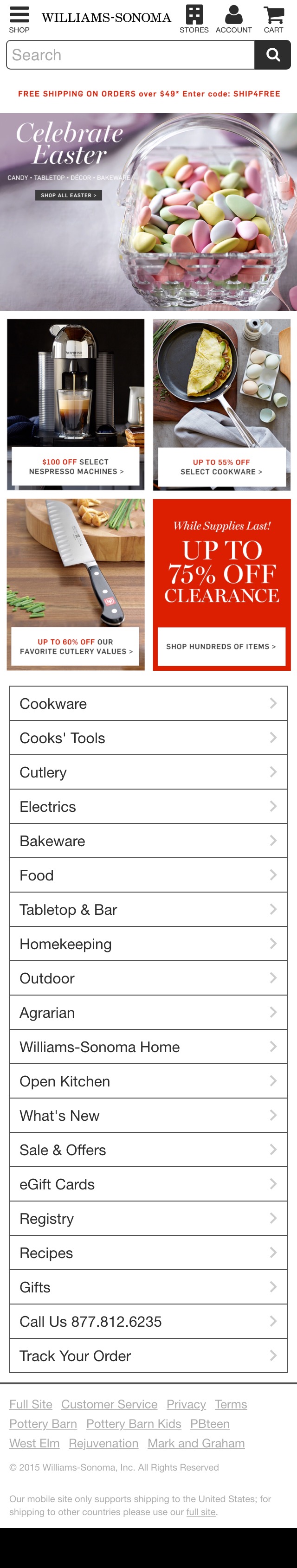 At Williams-Sonoma, a mix of graphics and categories are used but to the same effect – at top some key product types are visually illustrated with thumbnails, and below a list of links for the full site hierarchy.