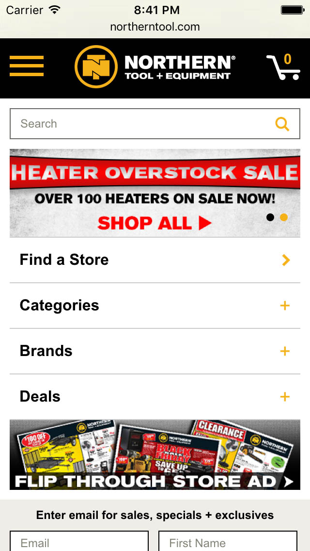 When featuring a selection or the full set of navigational links for the top-level categories, be sure not to collapse them behind a ‘departments’ or ‘categories’ link, as seen in the screenshot of Northern Tool. It doesn’t help users to infer the type of site they’ve landed on as user’s initial “scroll & scan” of the homepage won’t expose them to any of the site’s top-level categories. This design pattern only support repeat users in the form of a navigational shortcut.